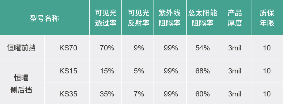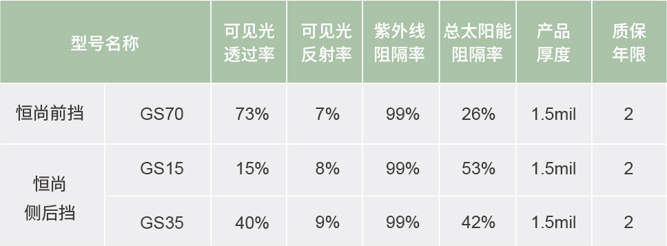| 产品系列 | 型号名称 | 可见光透过率 | 可见光反射率 | 紫外线阻隔率 | 总太阳能阻隔率 | 产品厚度 | 质保年限 | |