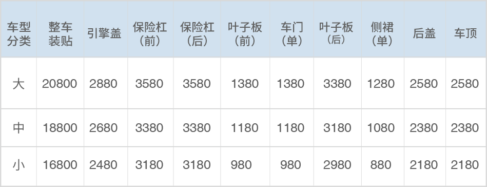 | 车型分类 | 整车装贴 | 引擎盖 | 前保险杠 | 后保险杠 | 前叶子板 | 车门 | 后叶子板 | 侧裙 | 后盖+车尾 | 车顶 |